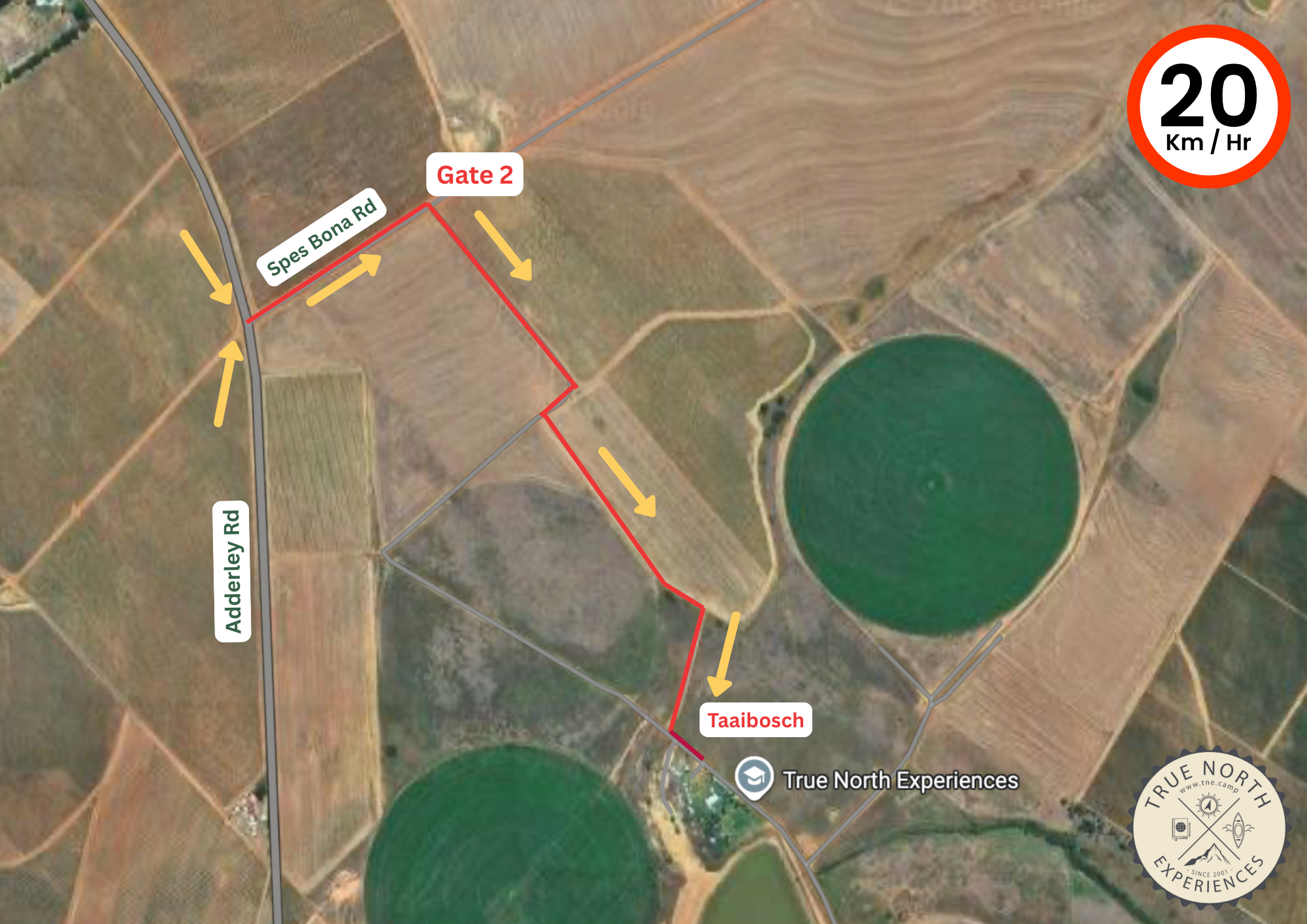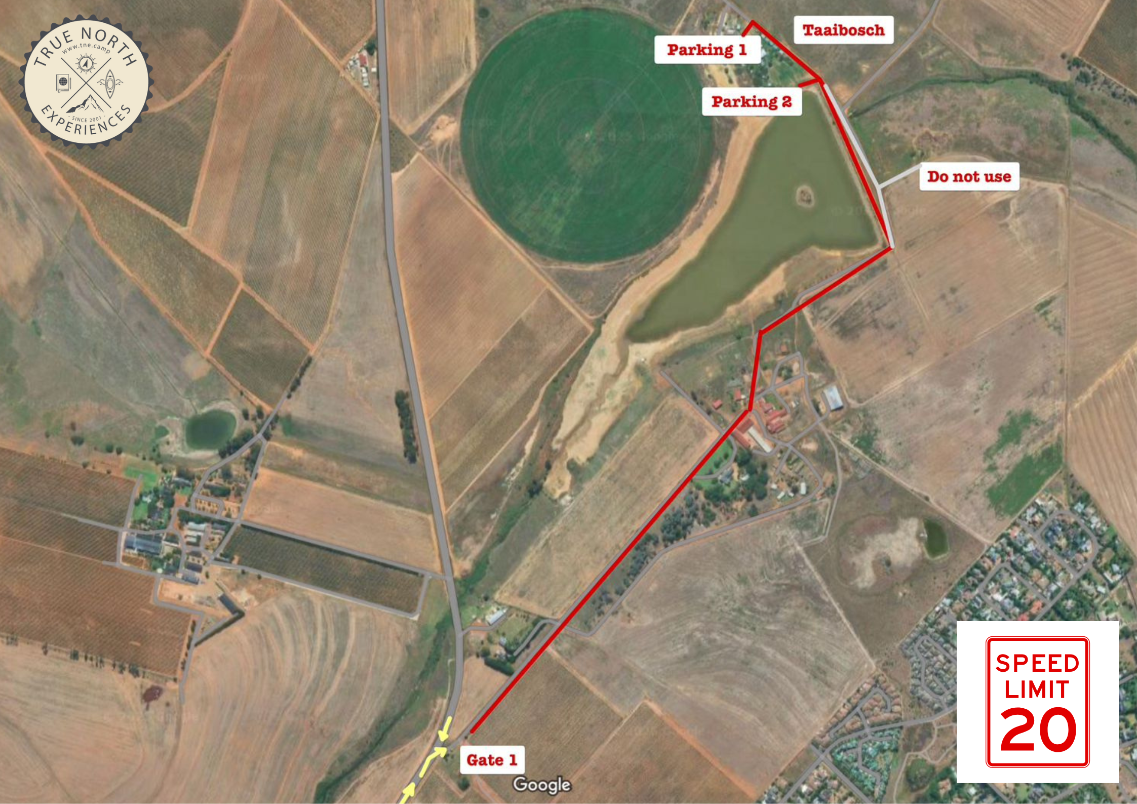 At all times, please keep to the speed limit of 20 km/h on the dirt road.